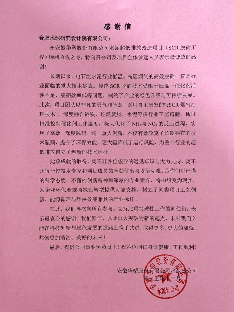 為積極響應(yīng)生態(tài)環(huán)境部等部委聯(lián)合發(fā)布的《關(guān)于推進實施水泥行業(yè)超低排放的意見》(環(huán)大氣〔2024〕5號),華塑水泥分公司早在2023年初即立項SCR脫硝項目,歷經(jīng)兩年多的市場調(diào)研、技術(shù)論證與案例考察,最終選擇與合肥院合作推進該超低排放改造工程。項目正式運行后,將顯著改善區(qū)域環(huán)境空氣質(zhì)量,對滁州市乃至全省水泥行業(yè)深度治理與綠色轉(zhuǎn)型起到重要的示范引領(lǐng)作用。不僅為行業(yè)提供了可復制的技術(shù)路徑和工程經(jīng)驗,也為推動我國水泥工業(yè)綠色轉(zhuǎn)型和環(huán)保事業(yè)進步作出了積極貢獻。
